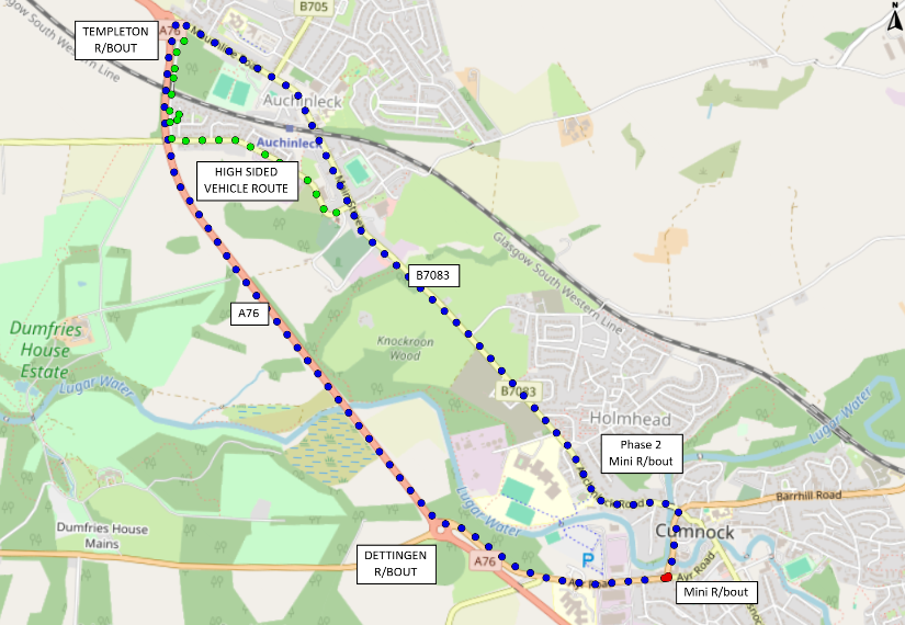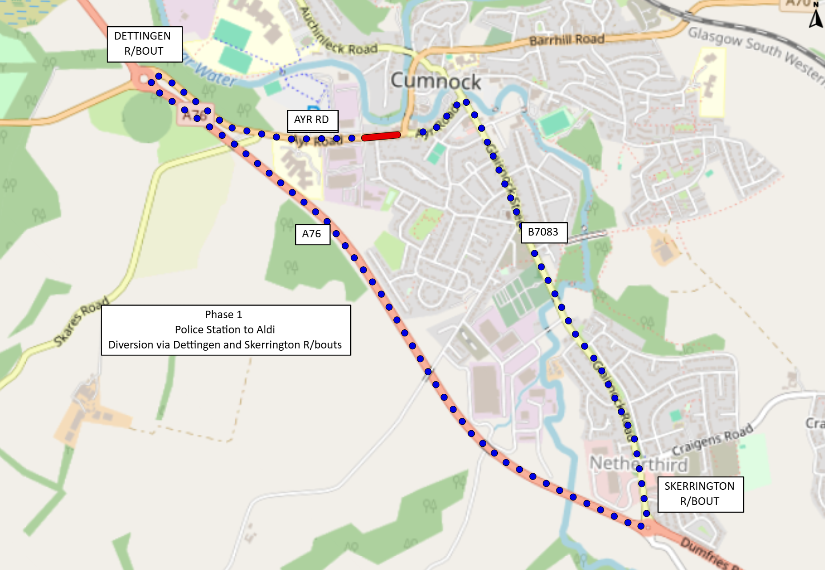 Phase 1: A70 Ayr Road, B7083 Glaisnock Street to Glaisnock Road to A76 Skerrington Roundabout to A76 Dettingen Roundabout before re-joining the A70 and vice versa.