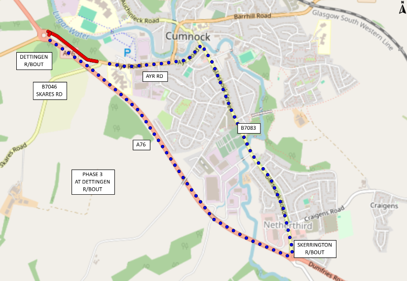 Phase 3: during works at Dettingen Roundabout: A70, Ayr Road to Glaisnock Street, Glaisnock Road to A76 Skerrington Roundabout, A76 Dettingen Roundabout and vice versa.